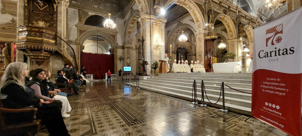 En un ambiente de profunda gratitud y comunión eclesial, los obispos de la CECh concluyeron la tarde de este 17 de abril su 133ª Asamblea Plenaria con una solemne Misa en la Catedral Metropolitana de Santiago. La eucaristía tuvo como eje central la conmemoración del 70° aniversario de Caritas Chile, institución que ha sido pilar fundamental del despliegue social de la Iglesia en el país. La misa fue presidida por el Arzobispo de La Serena y Presidente de la CECh, Mons. René Rebolledo Salinas, y fue concelebrada por el Nuncio Apostólico en Chile, Mons. Kurian Mathew Vayalunkal; el Arzobispo de Santiago, Cardenal Fernando Chomali Garib; el Cardenal Celestino Aós Braco y el Obispo de Arica y Presidente de Caritas, Mons. Moisés Atisha Contreras. Todos ellos en compañía de los demás pastores del Episcopado nacional.